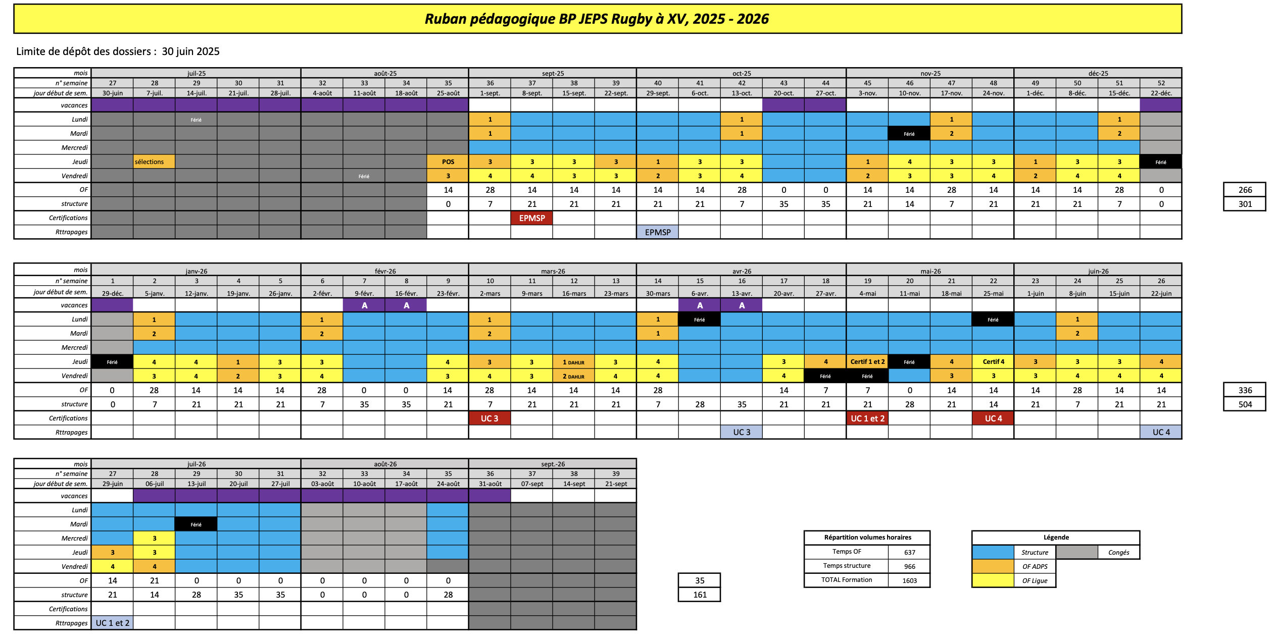 Le Brevet Professionnel de la Jeunesse, de l’Education Populaire et du Sport (BPJEPS) Rugby à XV est un diplôme professionnel de niveau 4, délivré par le Ministère des Sports constitué des 4 UC suivantes :
